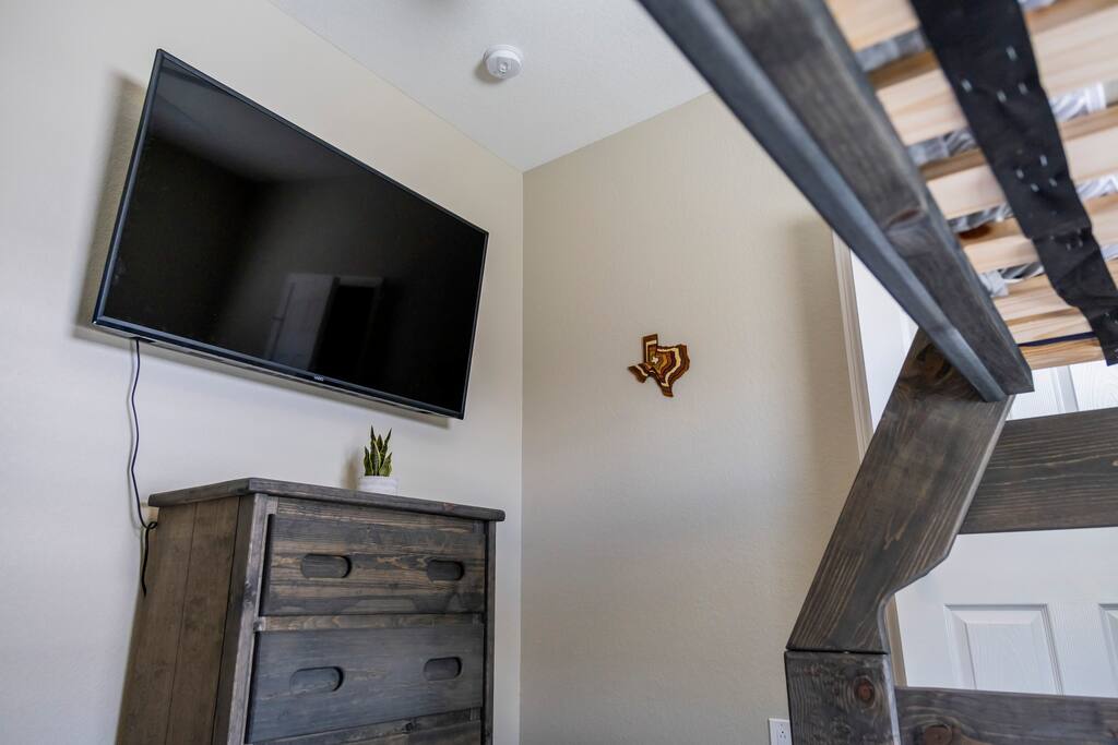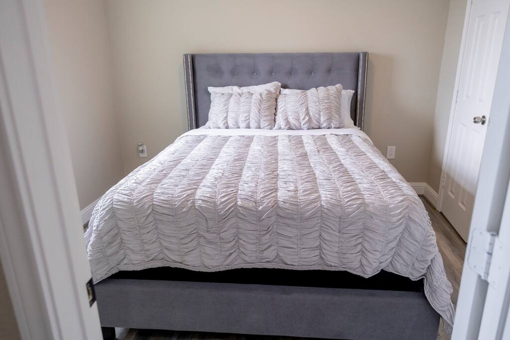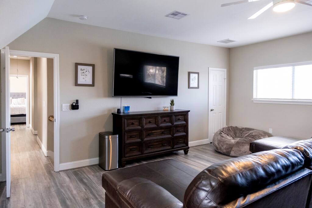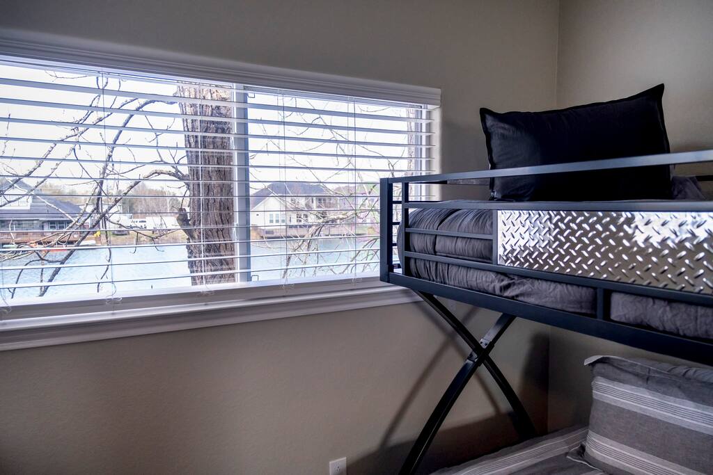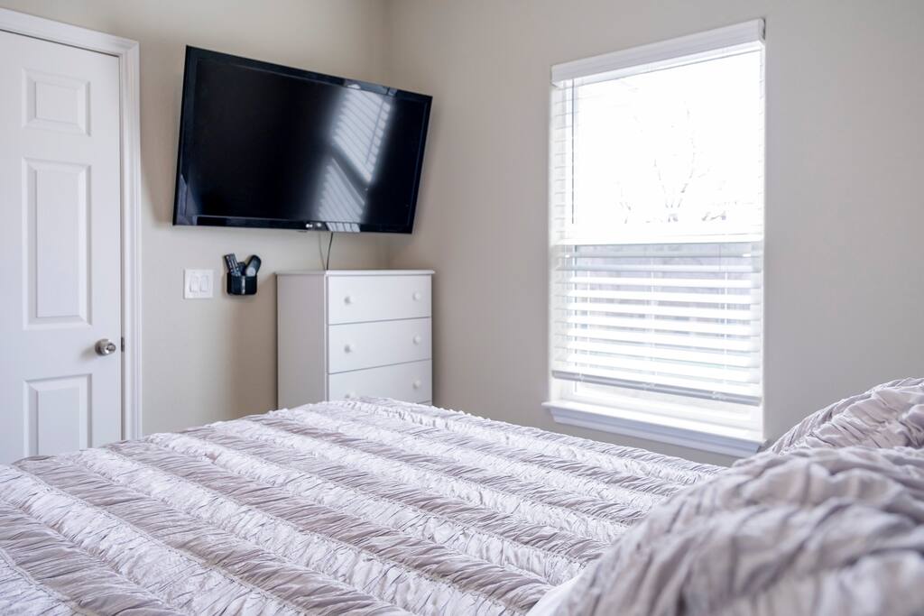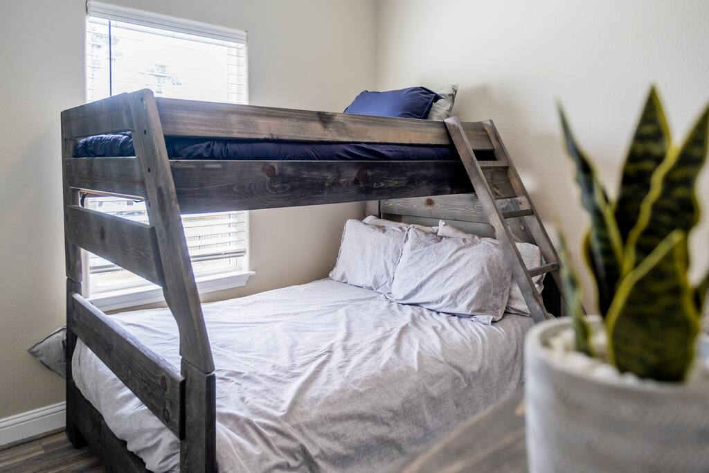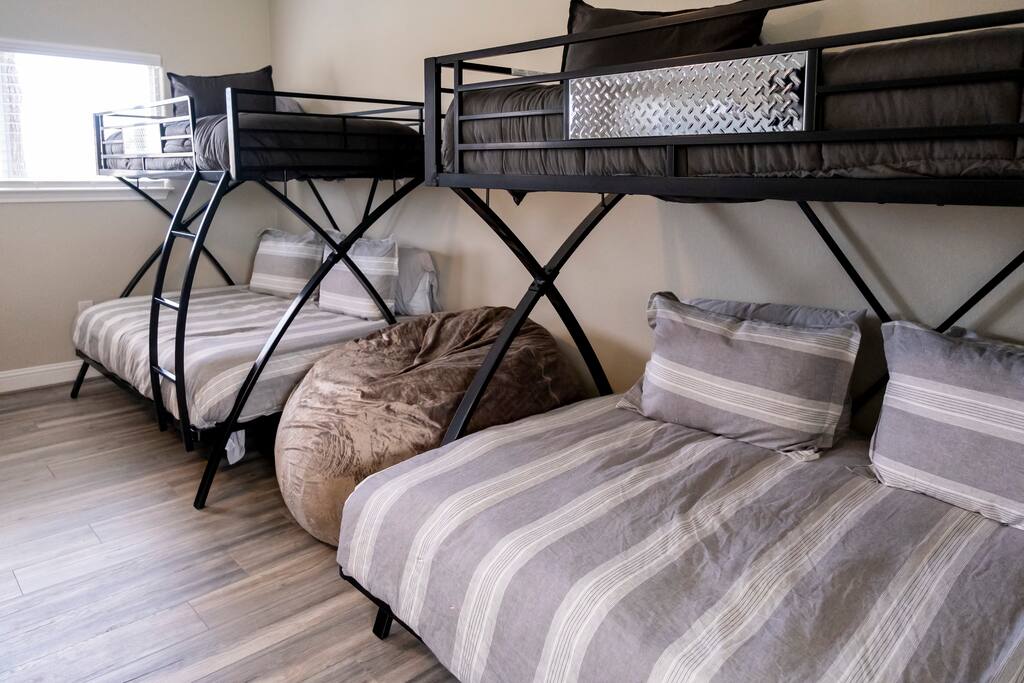 Bedroom 1 - King Bed and Master Bathroom Bedroom 2 - Queen Bed Bedroom 3 - Bunkbed (double bed on bottom / single on top) Living Room Upstairs - 2 Bunkbeds (double bed on bottom / single on top) The Living room upstairs has boardgames and a gaming system. There is a full bathroom upstairs in master bedroom, a full bathroom upstairs in hallway and a half bath downstairs. There are two closets downstairs for luggage/storage of items. Please consolidate the amount of cars needed. The driveway can accommodate 2 cars and there is street parking for 2 cars.